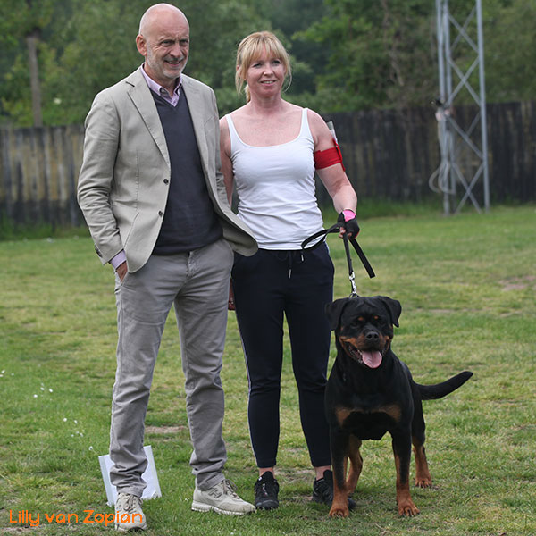 Elke foto is voorzien van de stamboomnaam in de kleur van het bandje dat deze hond in het nest droeg.